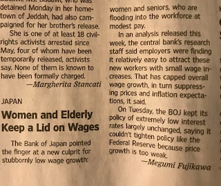 日銀は、 賃金がなかなか伸びない原因となっている新犯人を名指しした。 それは、女性と高齢者だ。 かれらは低賃金で労働市場になだれ込んできている。
